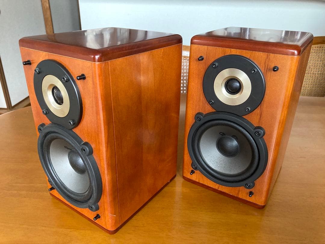 少しずつ値段を下げていきますので、ご納得の価格になったらご購入をご検討ください。\r\rD412EXは、オンキョーが誇った傑作スピーカーのひとつです。\rウーファーには独自の15cm「A-Silk OMF」やアルミ製イコライザーを採用することにより、滑らかでスピード感あふれる低音再生を実現しています。\rツィーターには高域再生に定評のある4cmチタンコート・リングを搭載しています。\rネットワークは原理的に磁気歪の発生しない空芯コイルを、またコンデンサーはドイツWIMA社製を使用し、上級仕様の厳選パーツを随所に採用しています。(一部メーカー資料より抜粋)\r\r本機をポップス・ロック用、B&W805をクラシック用と並べて使用していましたが、最近はポップスやロックを聴くことがなくなり出番がほとんどなくなったので、使っていただける方にお譲りしたいと思います。\r高域から低域まで非常にバランスの取れたタイトなサウンドのスピーカーです。\r805と比べると、フルオーケストラのようなふくよかで広がりのあるサウンドでは劣るものの、リズムのあるタイトなサウンドを再生すると、805をはるかに凌駕する迫力があります。\rそれぞれに個性はありますが、倍以上の価格の805と互角に張り合ってくれていました。\rかなりのボリュームで鳴らしてもバランスが崩れることはなく、ほとんど歪も感じません。\r\r商品の状態としては、あちこちに小さな傷がありますが、目立つのは一方のサイドにある当て傷です。(10枚目の画像参照)\r天板や底にもいくつか傷がありますので、画像で細部をご確認ください。\rユニットはいずれも正常で、オンキョーらしいタイトな音で鳴っています。\rサランネットには目立った痛みは見当たりませんが、見落としもあると思います。\rまた、写真は出来る限り分かりやすく写したつもりですが、画像では確認できない傷があると思いますので、ご理解の上でご検討くださいませ。\r\r以下、製品の仕様です。\r型式:2ウェイ・バスレフ型\r ウーファー:15cm\r ツィーター:4cmリング\r定格インピーダンス:4Ω\r最大入力:200W\r定格感度レベル:85dB/W/m\r周波数特性:37Hz〜100kHz\rクロスオーバー周波数:3kHz\r寸法:幅214×高さ347×奥行き323mm\r重量(1台):10.2kg\r価格:¥120,000(税別)